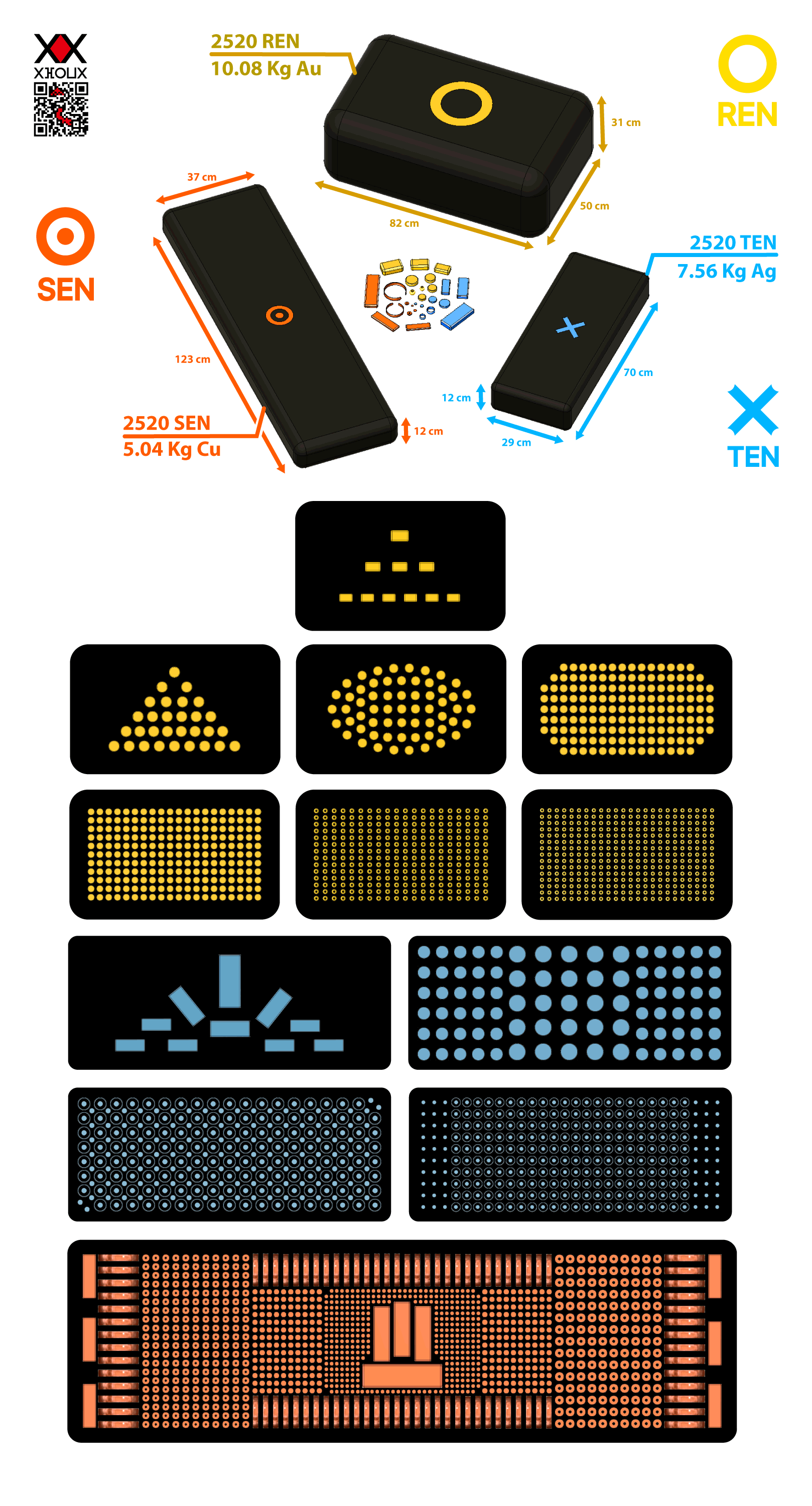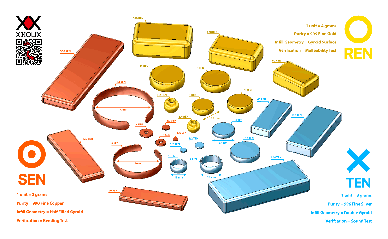 Gold Ren, Silver Ten and Copper Sen are 3 decentralized precious metal coins made from : Gold, Silver and Copper. The decentralized aspect of the coins is assured by the possibility to print the coins with any 3D Metal Desktop Printer with the right fineness powder. A minimal surface geometry is used so it can be easy to verify the coins by hand and hard to counterfeit in fineness.